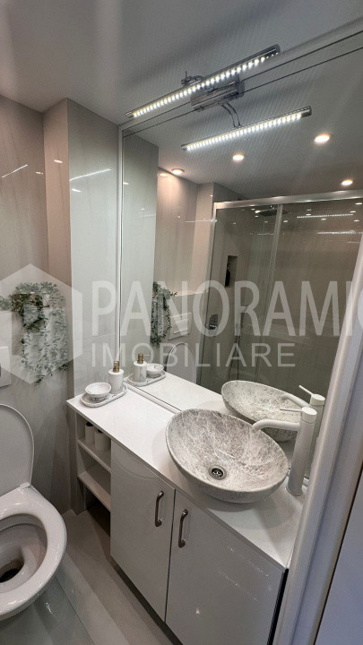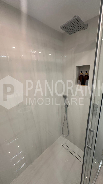 • Baie modernă, cu duș walk-in, finisaje contemporane și spații de depozitare